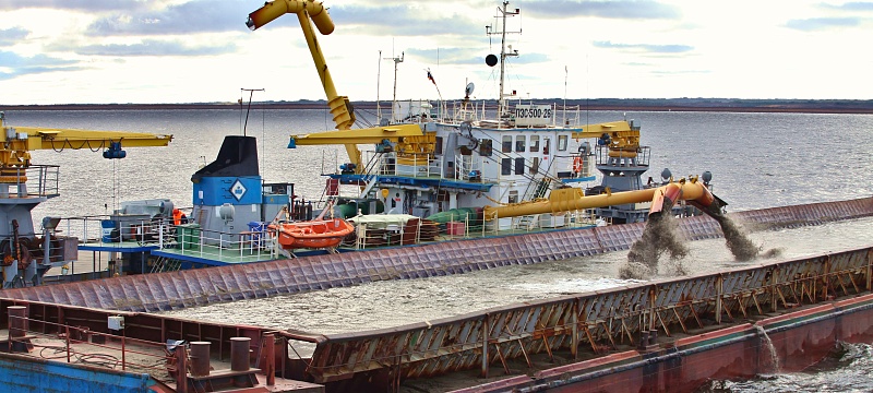 Енисейское пароходство добывает песок со дна реки Енисей на Грибановском месторождении, расположенном в 20 км от Дудинки, с помощью специального судна – земснаряда «ПЗС-500-26».